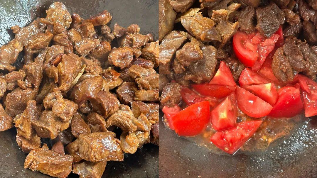 4、加入生抽、老抽、盐、白胡椒粉,翻炒至上色骄慢;把肉推到一边,加入2个去皮切块的番茄;