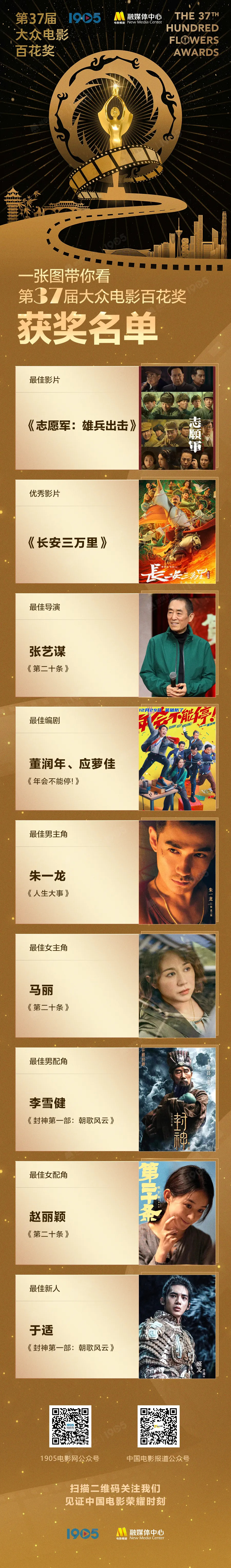 群星醒目蓉城,见证百花各大奖项揭晓。最终,《志愿军:雄师出击》荣膺本届百花奖最好影片,《长安三万里》荣获优秀影片;《第二十条》导演张艺谋夺得最好导演;董润年、应萝佳创作的《年会不可停!》获颁最好编剧;朱一龙凭借《东说念主生大事》捧得最好男主角,马丽以《第二十条》得益最好女主角;最好男蹧蹋、女蹧蹋分辨包摄《封神第一部:朝歌风浪》李雪健和《第二十条》赵丽颖;最好新东说念主则由《封神第一部:朝歌风浪》主演于适赢得。