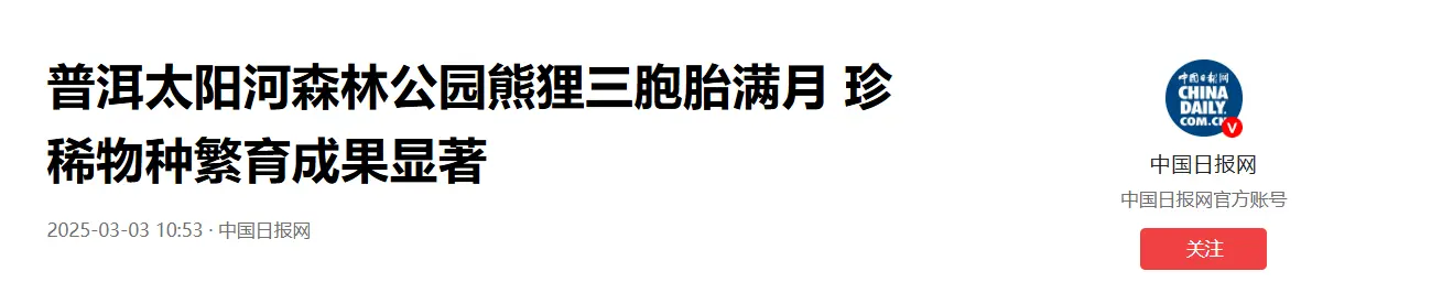 更令东谈主沸腾的是,在东谈主工的全心保育下,熊狸的繁育也获取了一定的得手,比如在云南的普洱太阳河丛林公园,2025岁首就迎来了健康的熊狸三胞胎。
