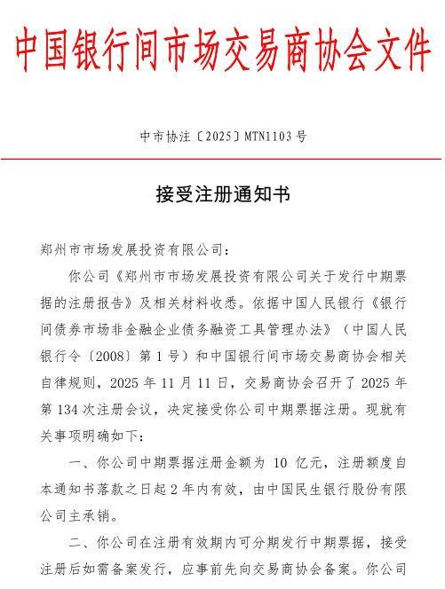 【大河财立方音信】12月16日,银行间往复商协会公告,接收郑州市阛阓发展投资有限公司中期单据注册,金额为10亿元,注册额度自2025年11月18日起2年内灵验现金九游体育app平台,由中国民生银行股份有限公司主承销。