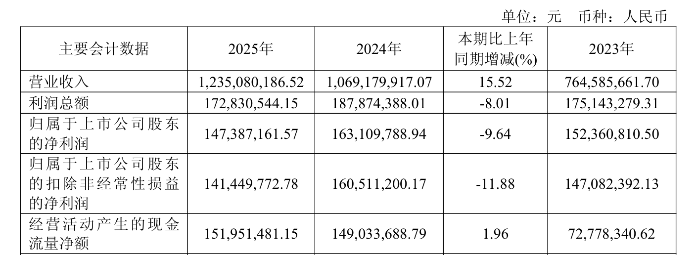 4月17日晚间,汇通控股(603409)发布上市首年收成单:2025年达成买卖收入12.35亿元,同比增长15.52%;归母净利润1.47亿元,同比着落9.64%;扣非净利润1.41亿元,同比着落11.88%。